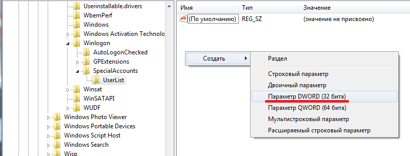 Нажмите правой кнопкой мыши на” UserList " и создайте новый параметр "DWORD (32 бита)".
