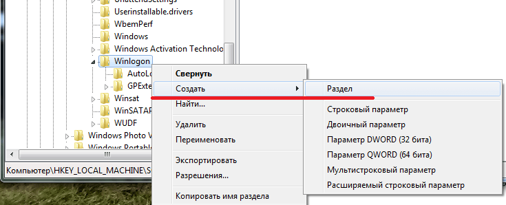 Нажмите правой кнопкой мыши на каталоге с именем “Winlogon” и выберите “Создать”, а затем “Раздел”, чтобы создать новый раздел внутри этого каталога.