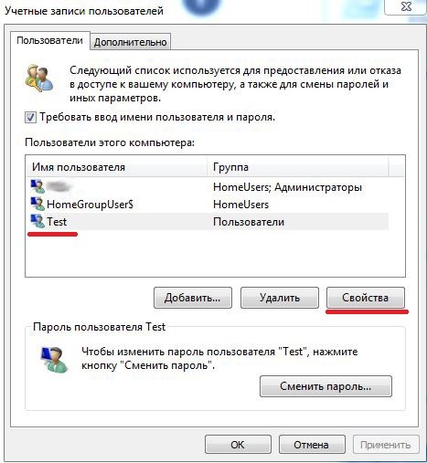 Вы увидите все учетные записи пользователей на вашем компьютере. Выделите учетную запись, которую необходимо скрыть, и нажмите “свойства”.