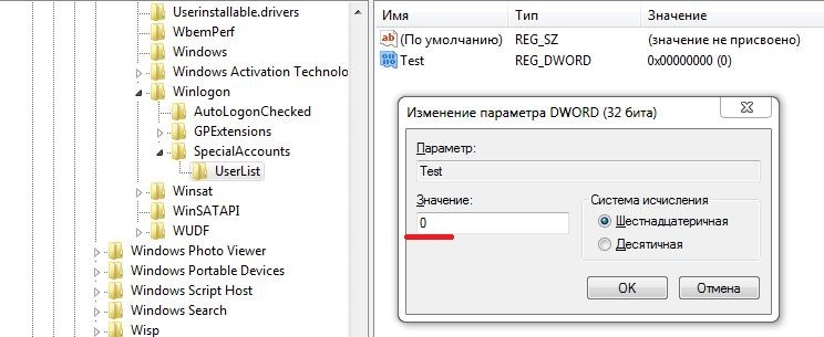 Для того чтобы учетная запись вновь появилась на экране приветствия Windows необходимо изменить значение параметра на "1" или переименовать параметр на имя несуществующего пользователя, например "Test1".