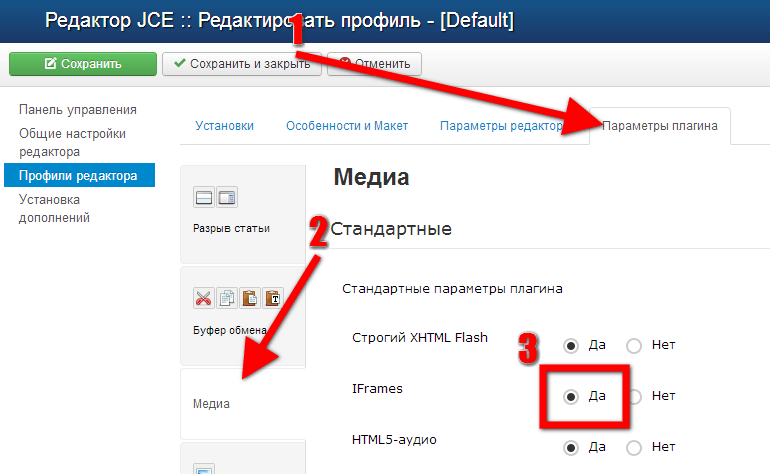 3. Задаём такую настройку как IFrames, что и позволит нам вставлять видео.