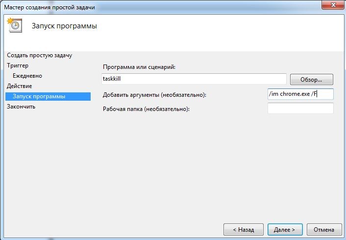 Задание создается точно так же, как для запуска программы, только в поле "Программа или сценарий" нужно прописать taskkill, а в поле "Добавить аргументы" прописать /im chrome.exe /F. /F параметр принудительного завершения
