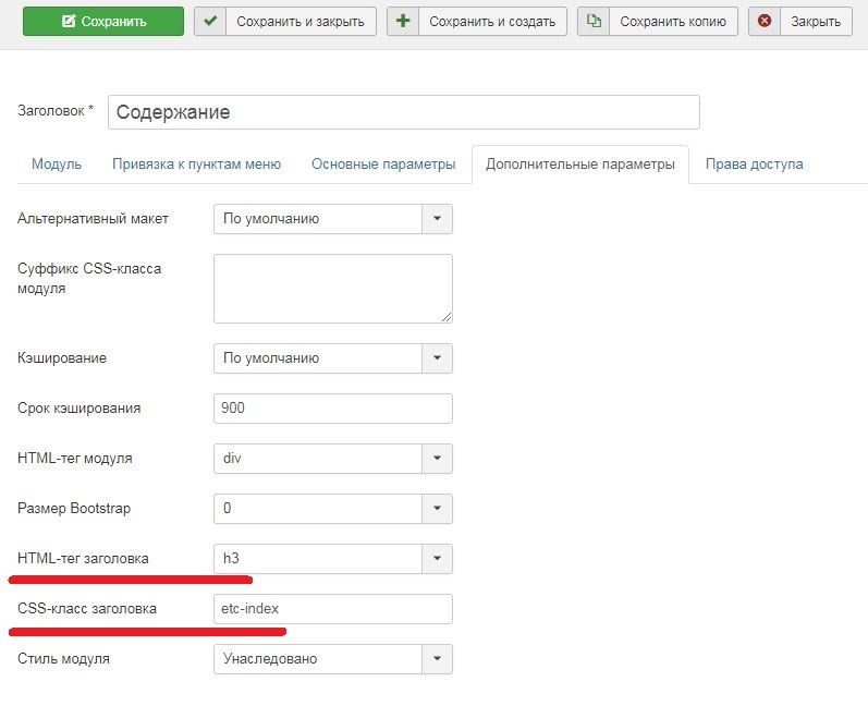Если необходимо добавить содержание в модуль, то нужно прописать в произвольный модуль "html-код" и прописать CSS класс заголовка, такой же, как и "Custom block class" в настройках плагина Extra ToC. Здесь же, в дополнительных параметрах модуля "HTML-код" можно указать, каким тегом будет выводится содержание (H1-H6).